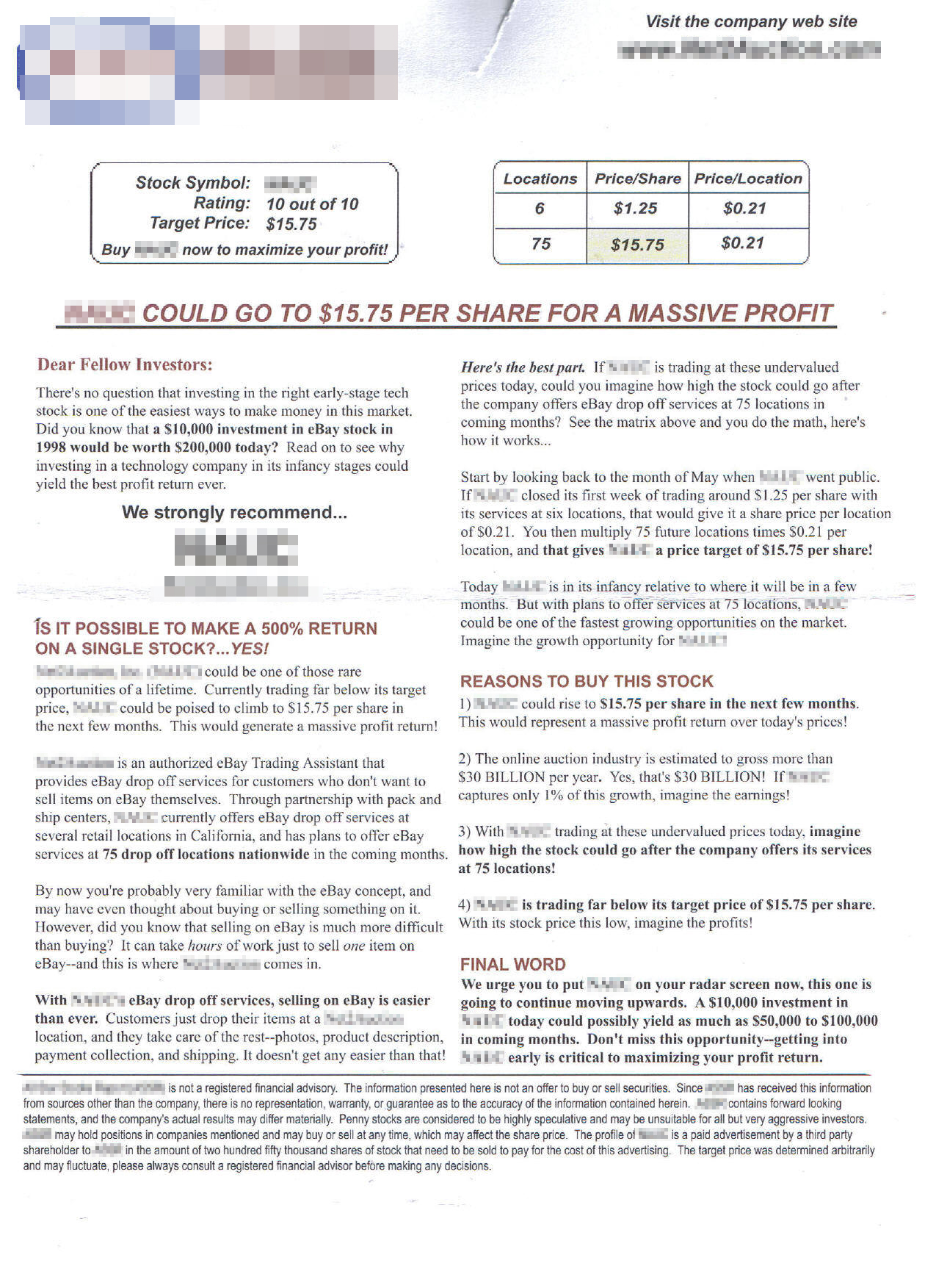 Translation: Someone who is also holding a boatload of this stock has given us many shares of stock to send out all these postcards and drum up some buyers for this stock so the share price will rise, and this certain someone can make a fortune. By the way, we’ll do pretty well ourselves!